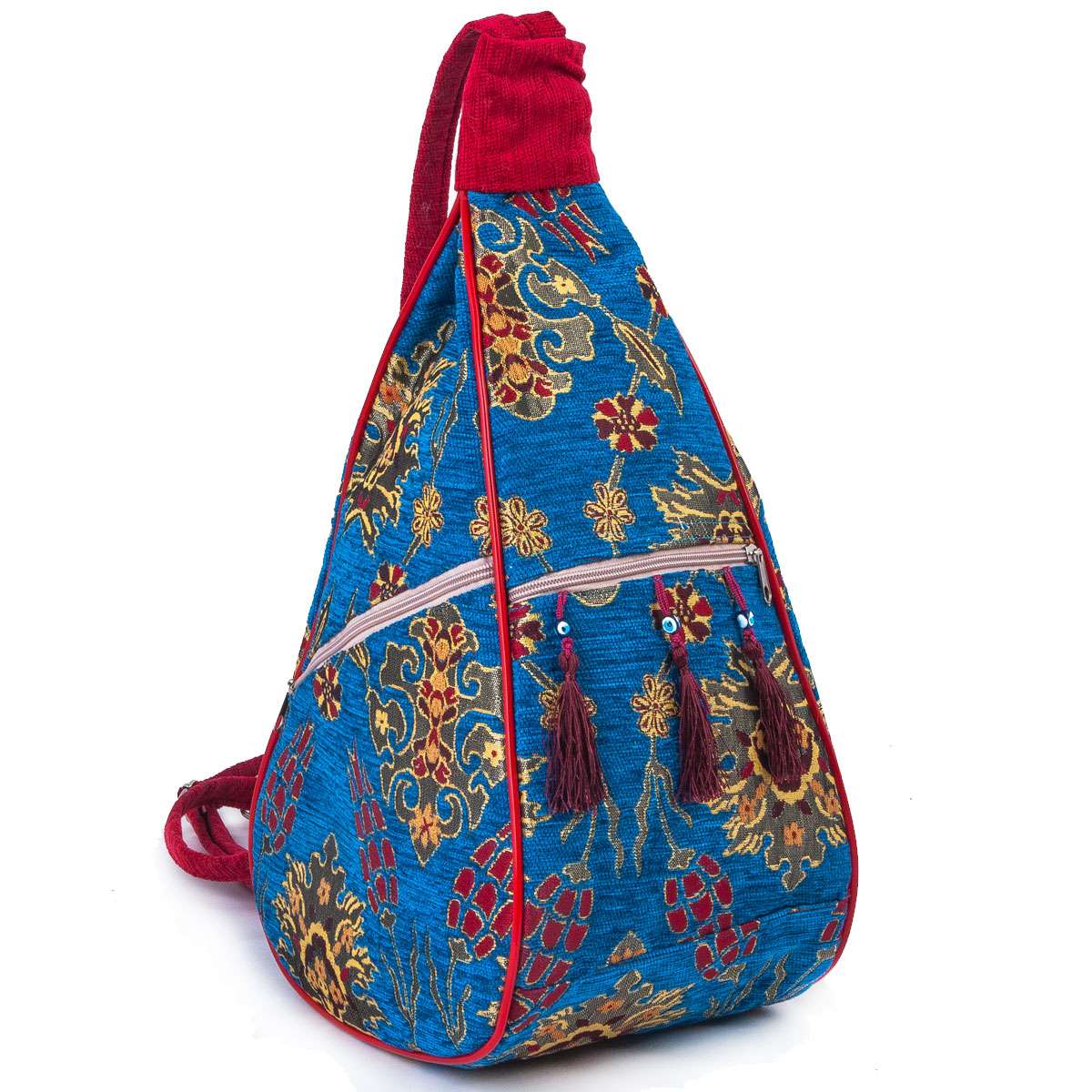 Armut çanta yada muz çanta olarak da bilinen bu çantamızın ön tarafında görsellik katmak amaçlı 3 adet püskül bulunmaktadır.